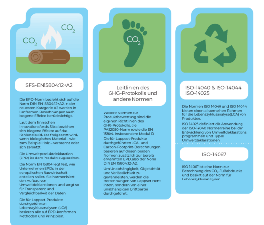 Der EPD-Standard bezieht sich auf die Norm SFS-EN15804:12+A2, wobei der letzte Eintrag, A2, bedeutet, dass Berechnungen gemäß dieser Norm auch biogene Effekte berücksichtigen.