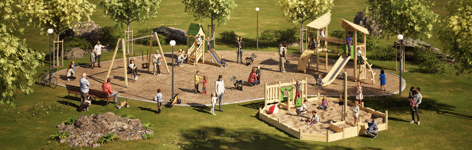 Eine naturnahe Umgebung, in der Kinder sich frei bewegen, einander begegnen und ihrer Fantasie folgen. Klettern, Rutschen, Schaukeln und gemeinsames Spielen sorgen hier für Movement for every heartbeat – spielerisch, einladend und im Einklang mit der Umgebung.