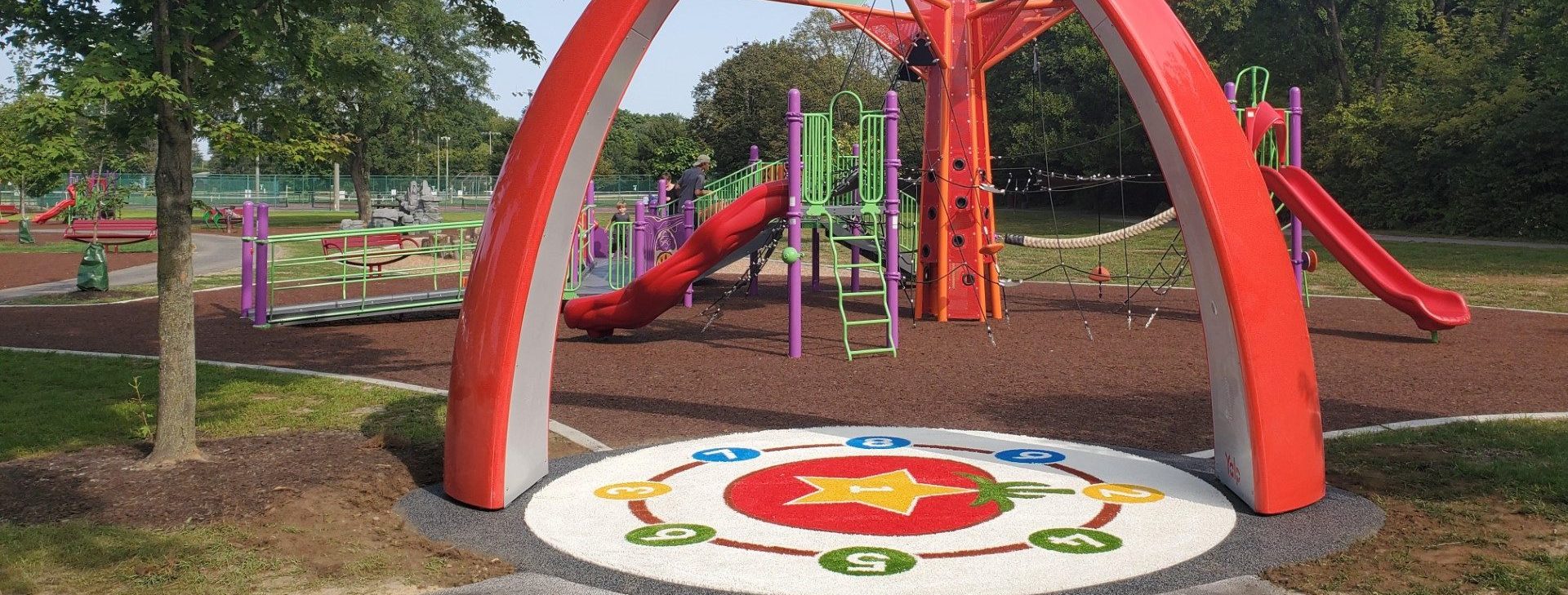 Sehe mich an! Ich stehe unter dem neu installierten interaktiven Lappset Sona – Spielbogen im JFK-Park in Reynoldsburg, OH, dem Ursprungsort der Tomate (beachte den maßgefertigten Boden mit der Tomate). Als ich unsere guten Freunde bei Midstates Recreation besuchte, hatte ich die Gelegenheit, diesen Spielplatz zu besuchen und aus erster Hand zu sehen, welche Aufregung die Kinder beim Spielen auf diesem Spielplatz hatten. Ihre Freude und ihr Lachen waren ein klarer Beweis dafür, dass die Integration von Technologie und Spiel eine erfolgreiche Kombination ist.